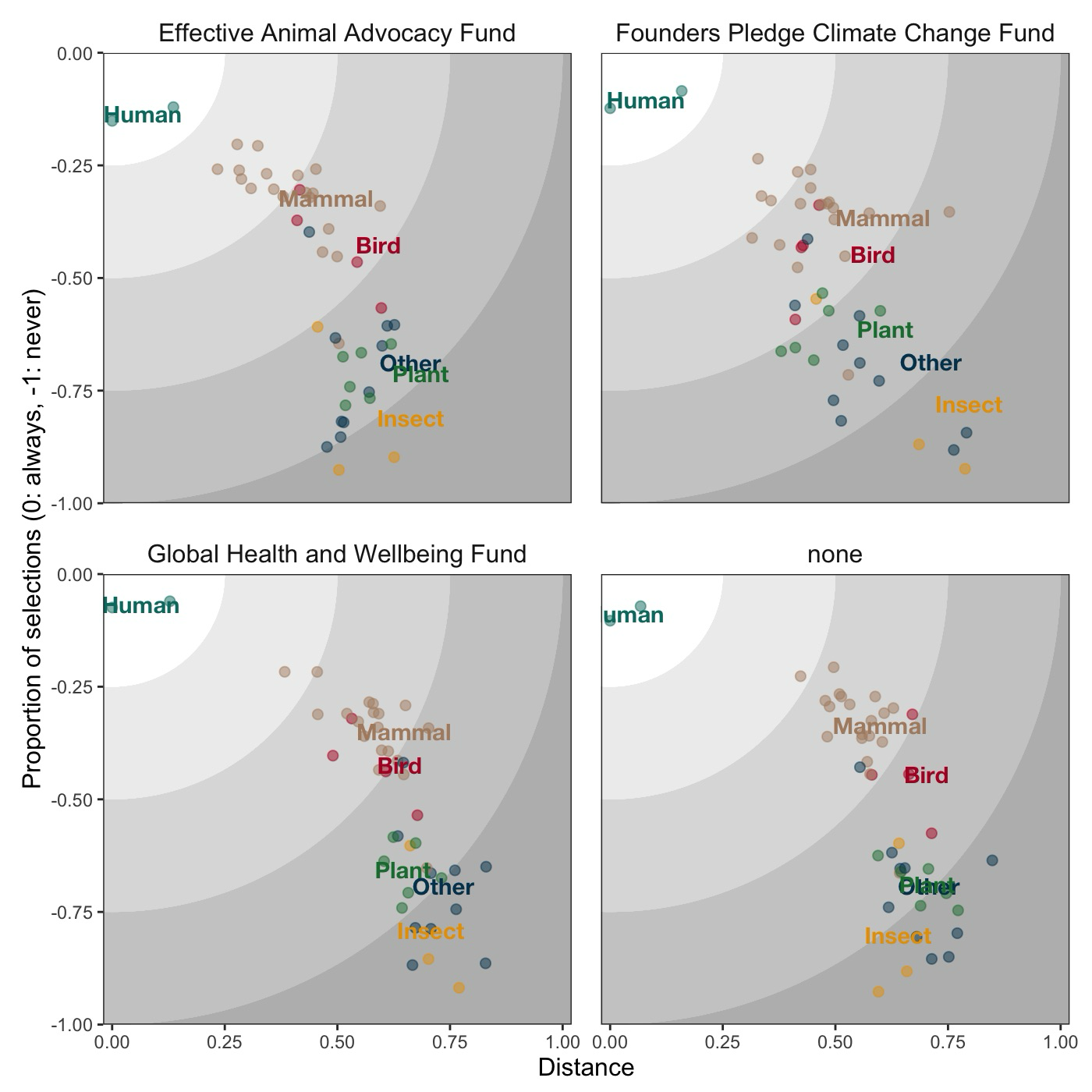 On the other hand, although humans were still morally prioritised by participants who decided to donate some of their winnings to an environmental or animal welfare fund, there was a shift in how closely related those participants perceived other entities, such as animals and plants, to be. Environment-based donors showed relatively higher support for plants than other groups of participants, and they felt closer to a wider range of entities. Among donors to the animal fund, there was almost no difference in moral prioritisation (y-axis) and moral closeness (x-axis) between humans and other entities.