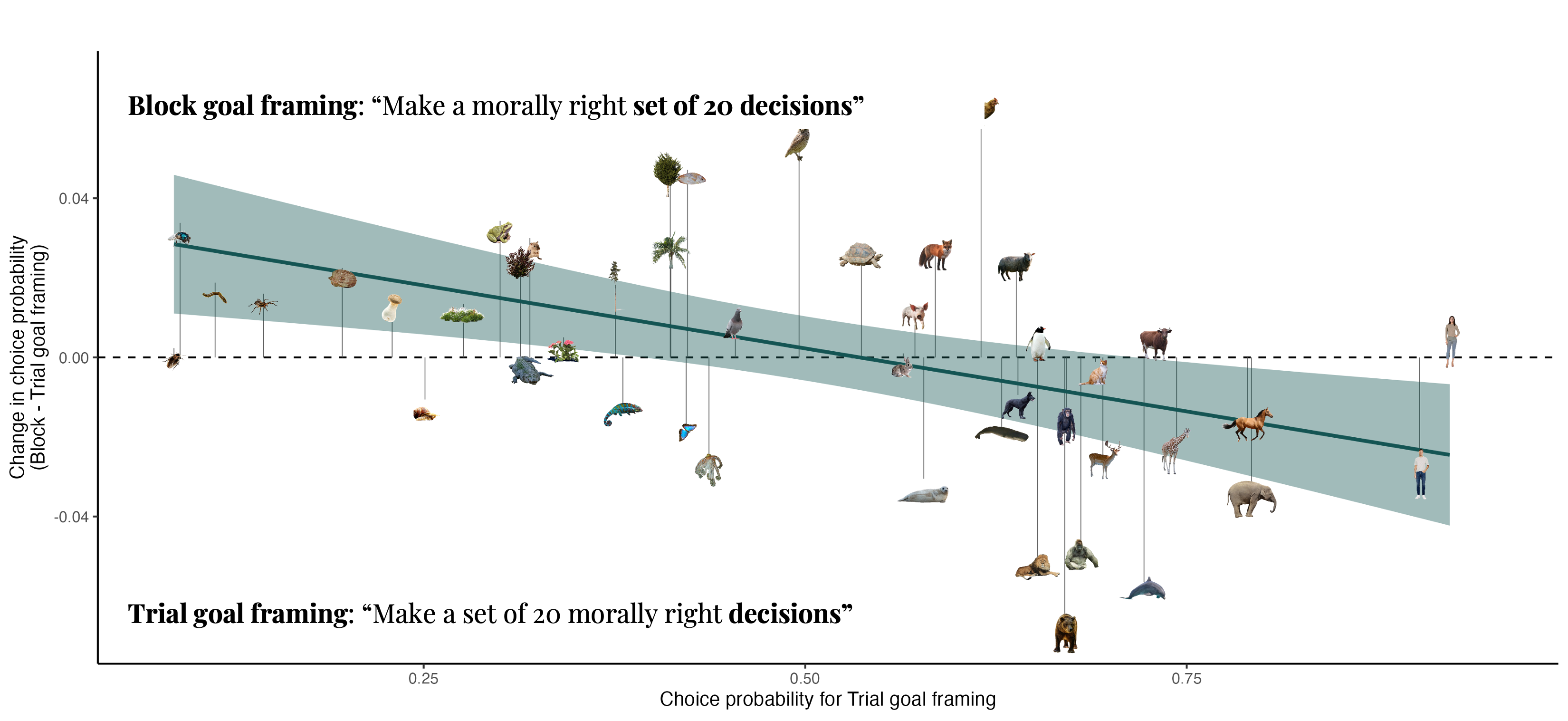 In this second experiment, we investigated whether the value we attribute to entities is fixed or relative, i.e., if it is always the same or if it depends on how the task is framed: saving or prioritising individual entities or groups of entities. To achieve this, we adapted the design of the original experiment: participants could either make one large decision to save 20 entities (block goal frame), or 20 smaller decisions to save one entity each(trial goal frame). We were interested to see whether the value of the entities would differ depending on how the dilemma was framed.